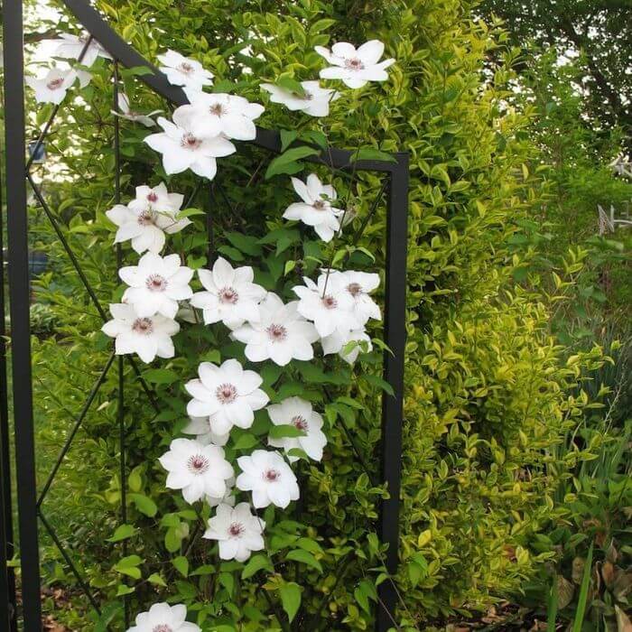 Clematis ‘Maria Kaczyńska’ to odmiana o białych kwiatach, o okrągłych płatkach, przez które przechodzi przez środek żebrowanie. Brzegi płatków są pofalowane co dodaje uroku tym półpełnym kwiatom. Purpurowe pylniki ułożone na białych nitkach przyciągają uwagę i sprawiają, że kwiat jest jeszcze bardziej atrakcyjny. Clematis kwitnie w VI-VII.