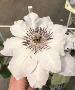 Clematis ‘Maria Kaczyńska’ to odmiana o białych kwiatach, o okrągłych płatkach, przez które przechodzi przez środek żebrowanie. Brzegi płatków są pofalowane co dodaje uroku tym półpełnym kwiatom. Purpurowe pylniki ułożone na białych nitkach przyciągają uwagę i sprawiają, że kwiat jest jeszcze bardziej atrakcyjny. Clematis kwitnie w VI-VII.