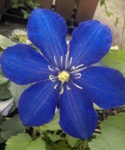 Niezwykły powojnik o pięknych szafirowo niebieskich kwiatach o średnicy około 13 cm z uroczymi żółtymi pręcikami w środku.
