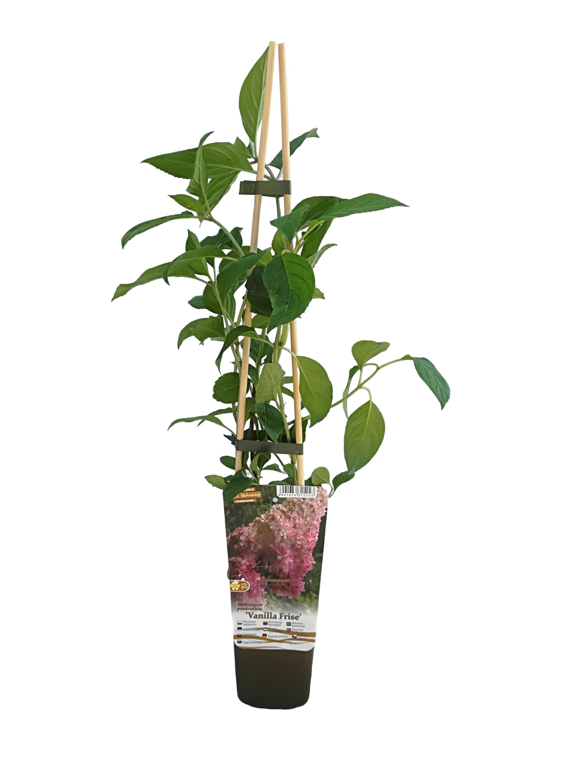 Hortensja Vanille Frise to bardzo dekoracyjna odmiana bukietowa. Krzew o wyprostowanym pokroju osiąga ok. 2 m wysokości i 1,5 m szerokości. Charakteryzuje się czerwonymi pędami i pięknymi dużymi kwiatami osiagającymi nawet do 40 cm długości. Kwiaty te początkowo białe szybko różowieją. Roślina całkowicie mrozoodporna.