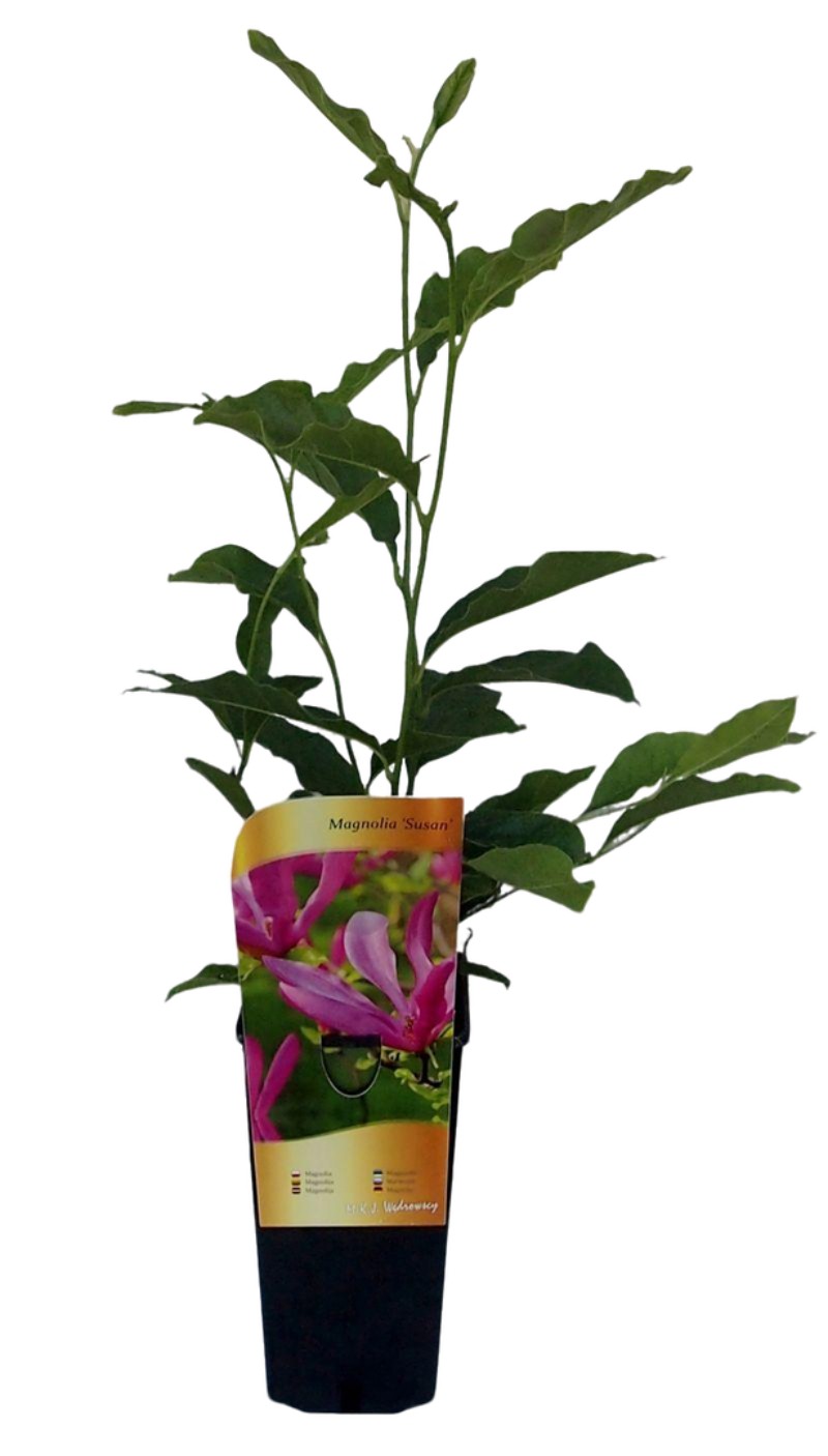 Magnolia ‘Susan’ to jedna z najłatwiejszych w uprawie i najbardziej mrozoodpornych odmian. Tworzy rozłożysty krzew o regularnej koronie, dorastający do 4 m wysokości. Kwitnie długo i obficie – od kwietnia do maja – zdobiąc ogród dzwonkowatymi, przyjemnie pachnącymi kwiatami w kolorze ciemnego amarantu.