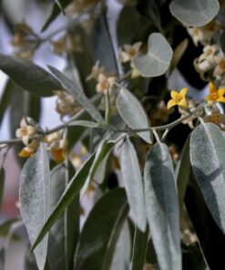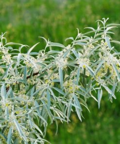 Kwitnienie i owocowanie: Liście skrętoległe, lancetowate, do 5 cm długości, srebrzystoszare do 10 cm długości, opadające na zimę. Kwiaty bezpłatkowe, promieniste, rurkowate, silnie i przyjemnie pachnące, wewnątrz żółte, z zewnątrz srebrzystoszare, osadzone po 2-3 w kątach liści. Kwitnie w połowie czerwca. Owocem jest jadalny, suchy i mączysty pestkowiec, bardzo długo utrzymujący się na gałązkach. Zaczyna owocować już 4-6 roku życia.