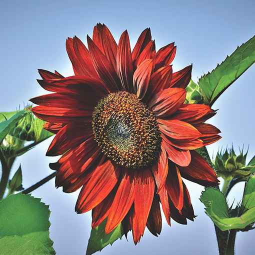 Ten unikatowy słonecznik przyciąga uwagę swoimi mahoniowymi kwiatami na długich, sztywnych, zielonych pędach Niezwykłe ubarwienie sprawia, że roślina jest atrakcyjna na działce, ale również jako kwiat cięty w donicy.