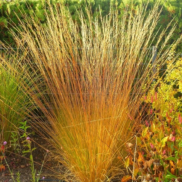 Trzęślica modra ‘Heidebraut’ to efektowna trawa ozdobna tworząca zwarte kępy liści o wysokości około 45 cm. Jej ciemnozielone liście stanowią tło dla sztywnych pędów kwiatostanowych, które pojawiają się w sierpniu i dorastają nawet do 140 cm. Wąskie, wiechowate kwiatostany początkowo mają jasny odcień, a z czasem przebarwiają się na intensywnie ciemnoczerwony. Jesienią cała kępa przybiera bursztynową barwę, zachowując dekoracyjność również zimą.