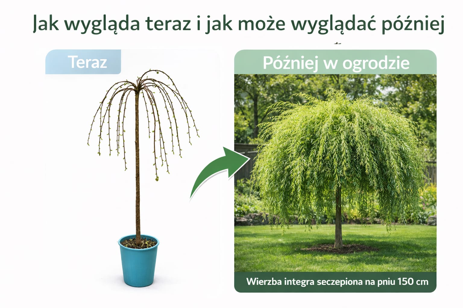 Wierzba całolistna ‘Integra’ szczepiona na pniu to wyjątkowa ozdoba ogrodu, która po formowaniu tworzy malownicze, niewielkie drzewko o delikatnie przewieszających się pędach. Jej największym atutem są dekoracyjne, czerwone gałązki pięknie prezentujące się zimą oraz dwubarwne liście – zielone z subtelnym, różowym odcieniem. Już wczesną wiosną roślina obsypuje się miękkimi, puszystymi baziami, które są jednym z pierwszych sygnałów nadchodzącej wiosny.