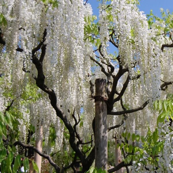 Przepięknie kwitnące pnącze o kwiatach białych, zebranych w długie grona (do 60 cm). Glicynia przez 2-3 lata po posadzeniu rośnie wolno i wymaga szczególnie starannej pielęgnacji i osłaniania na zimę. Potem rośnie silnie, wytwarzając 1-3 m przyrostu rocznie, osiągając wysokość 10 m i więcej. Wisteria dobrze rośnie i czuje się w glebie żyznej, próchniczej,lekko przepuszczalnej i głębokiej. Lubi stanowisko ciepłe, słoneczne, osłonięte od silnych i zimnych wiatrów.